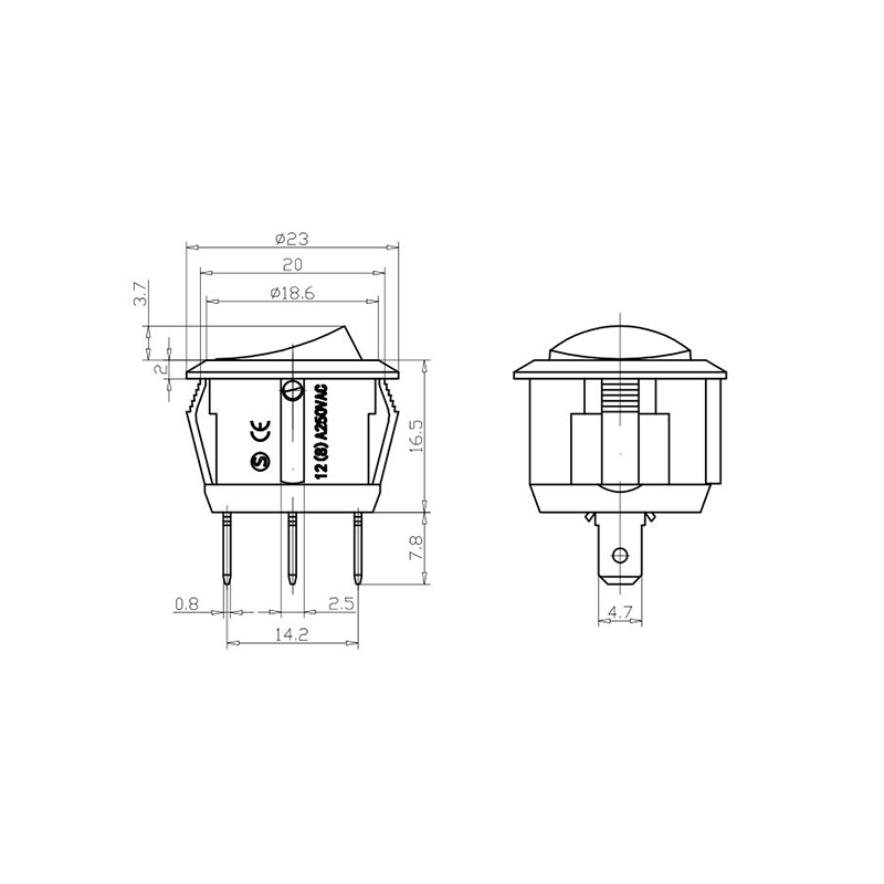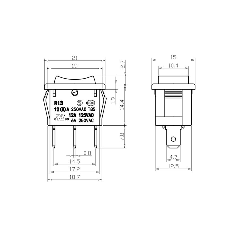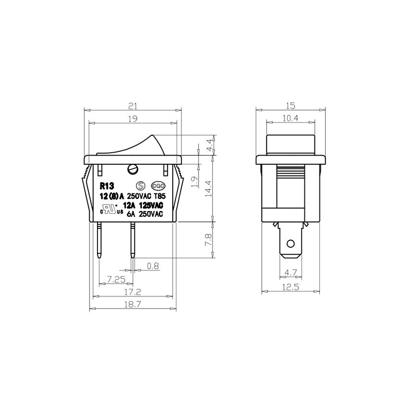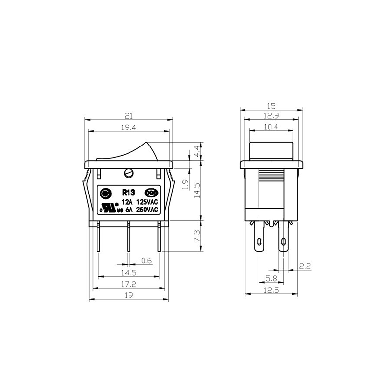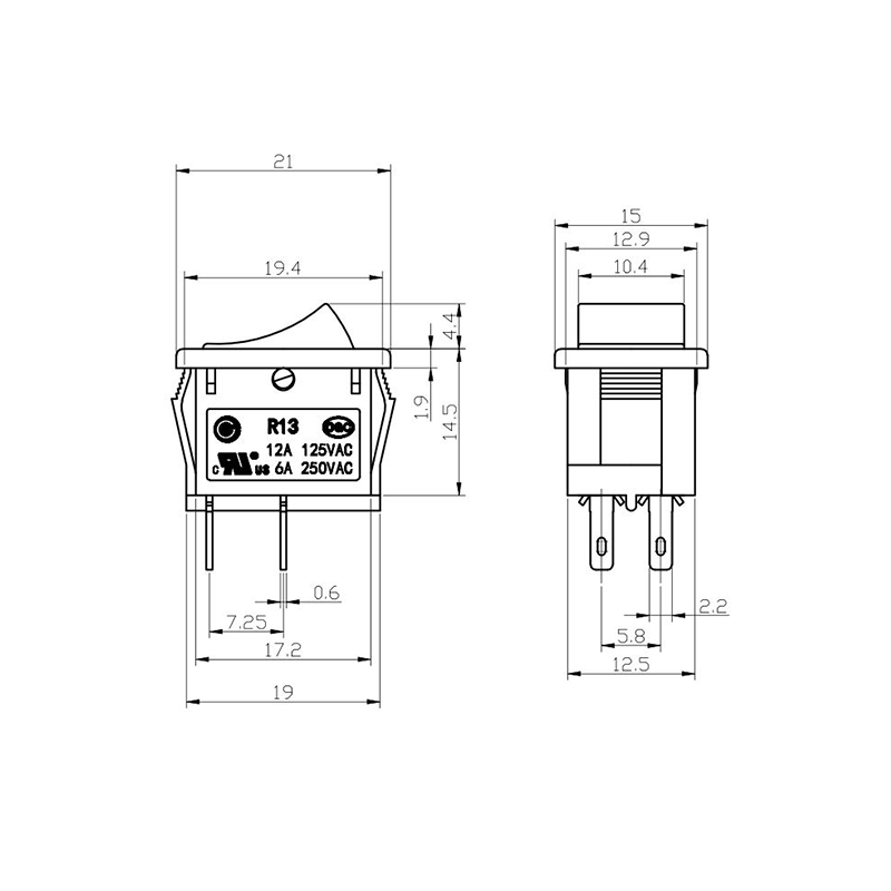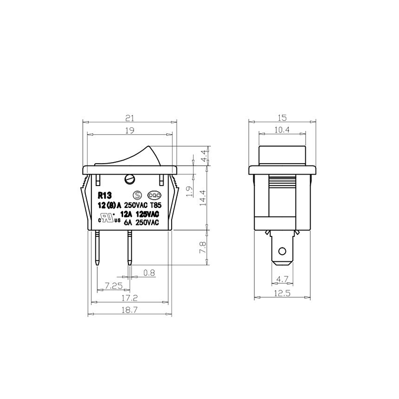 Dari segi kefungsian, siri R13-13 menyediakan susun atur terminal 2-pin dan 3-pin, menyokong konfigurasi litar SPST (Single Pole Single Throw) dan SPDT (Single Pole Double Throw) untuk menampung pelbagai keperluan reka bentuk elektrik. Tanda "0/1" yang jelas pada penggerak menjadikannya mudah untuk dikendalikan, manakala pilihan warna dalam hitam dan putih membolehkan konsistensi visual dengan reka bentuk produk akhir.